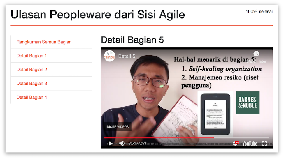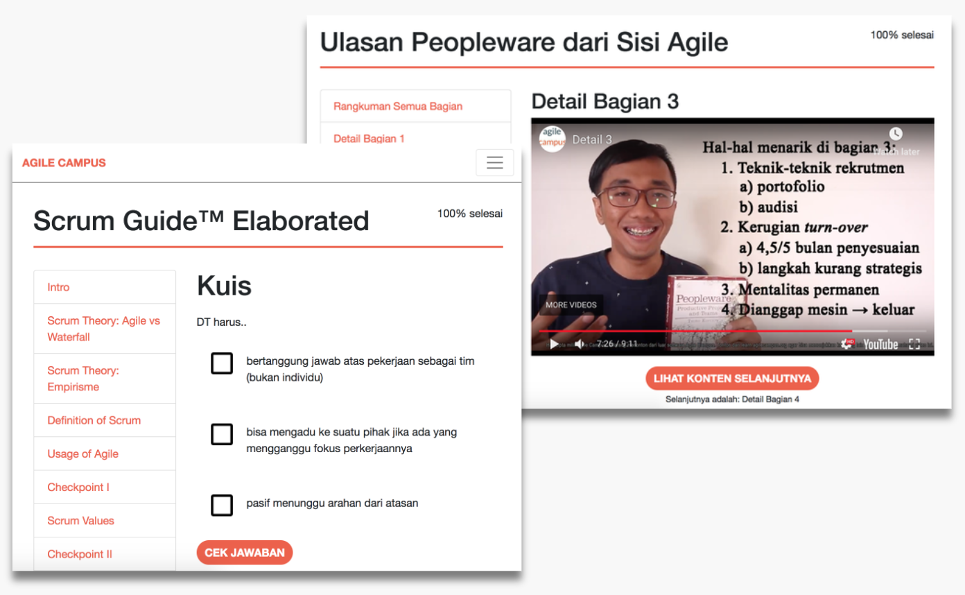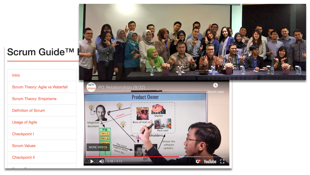 Kami bukan marketplace online course; kami memproduksi sendiri seluruh konten—video, artikel, kuis. Selain kompeten 5 tahun mengajar agile, kami juga memiliki pengalaman mendampingi implementasi bingkai kerja agile di perusahaan-perusahaan Indonesia. Selepas sesi kursus, peserta akan dapat sertifikat yang bisa ditunjukan ke semua orang.