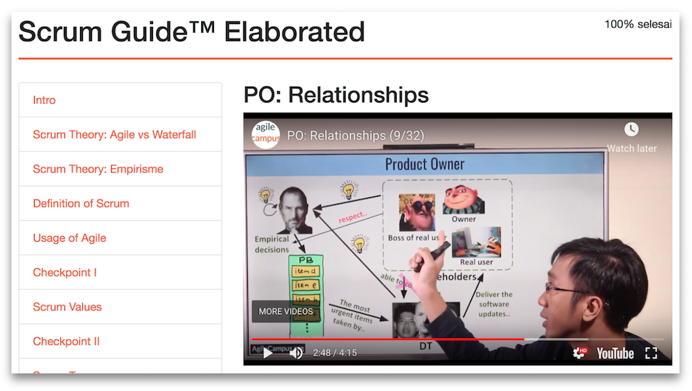 Cara terbaik belajar Scrum karena: 1) 100% berbasis pada struktur dan konten Scrum Guide™—panduan resmi Scrum, 2) dilengkapi dengan ilustrasi visual, 3) detail penerapan yang memang tidak ada di Scrum Guide, 4) suka-duka penerapan di dunia nyata.